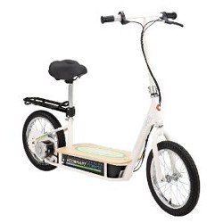 EcoSmart Metro Electric Scooter: The Advanced Street Systems by Razor. Designed for true neighborhood transportation. Clean! Green! No gasoline needed! The EcoSmart Metro Electric Scooter is fun, and most of all affordable. Reduces pollution and conserve energy with the Metro Scooter! This Electric Scooter combines comfortablity, style, and functionality with its ultra padded seat, rear disc braking system, adjustable handlebar rake and seat, detachable luggage rack/rear fender, bamboo deck, and stylish powder coated frame. Using standard bicycle size 16” pneumatic tube tires on spoke wheels makes for easy replacement. Powered by a 500W extra high torque motor and 36 volt electrical system, 7 AH (amp-hour) battery. Just twist and go with the variable speed hand throttle control. Battery weight is also balanced on center line of frame. Travels 18-20 Miles per hour and has a running time up to 60 minutes. Recommended for riders up to 220 lbs. Some assembly required -Tools included.